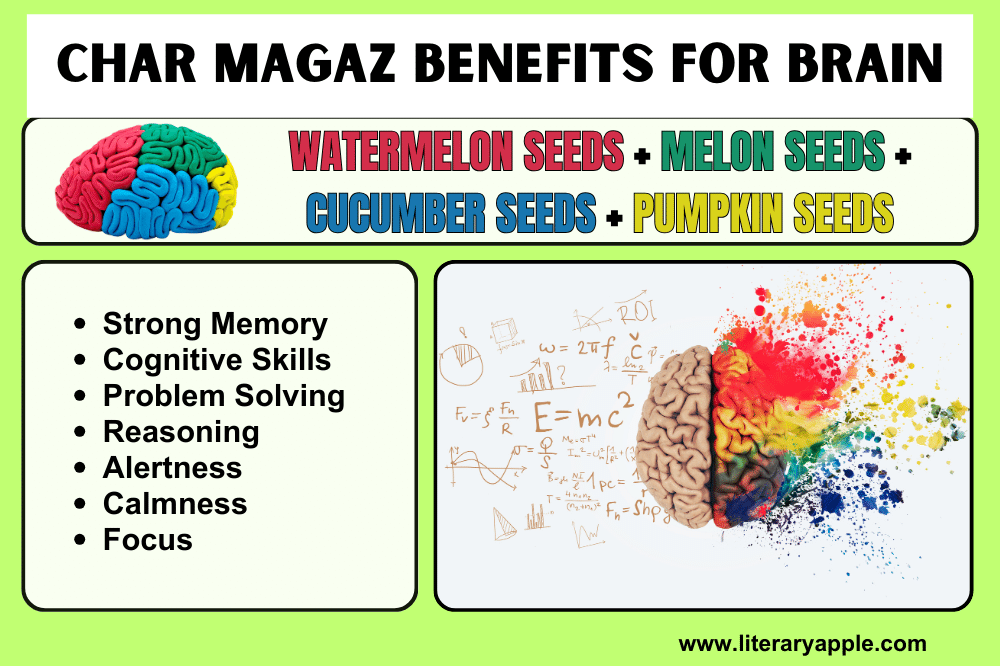Chaar magaz, as shown in its name it is one kind of blend of four brain-boosting seeds. There are four types of seeds included in char magaz: cucumber seeds, melon seeds, pumpkin seeds, and watermelon seeds. Chaar magaz provides you with surprising health benefits because they are rich in vitamins, minerals, fatty acids, and proteins.