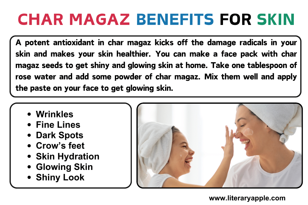 A potent antioxidant in char magaz kicks off the damage radicals in your skin and makes your skin healthier. Oils of the char magaz prevent your skin from wrinkles, fine lines, dark spots, and crow’s feet. Lower the risk of skin cancer and keeps your skin hydrated. You can make a face pack with char magaz seeds to get shiny and glowing skin at home. Take one tablespoon of rose water and add some powder of char magaz. Mix them well and apply the paste on your face to get glowing skin.