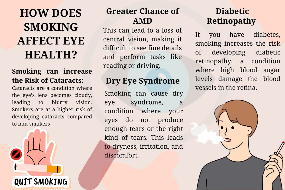 Smoking can cause dry eye syndrome, a condition where your eyes do not produce enough tears or the right kind of tears. This leads to dryness, irritation, and discomfort. The smoke itself can irritate the eyes, making the symptoms of dry eye worse.